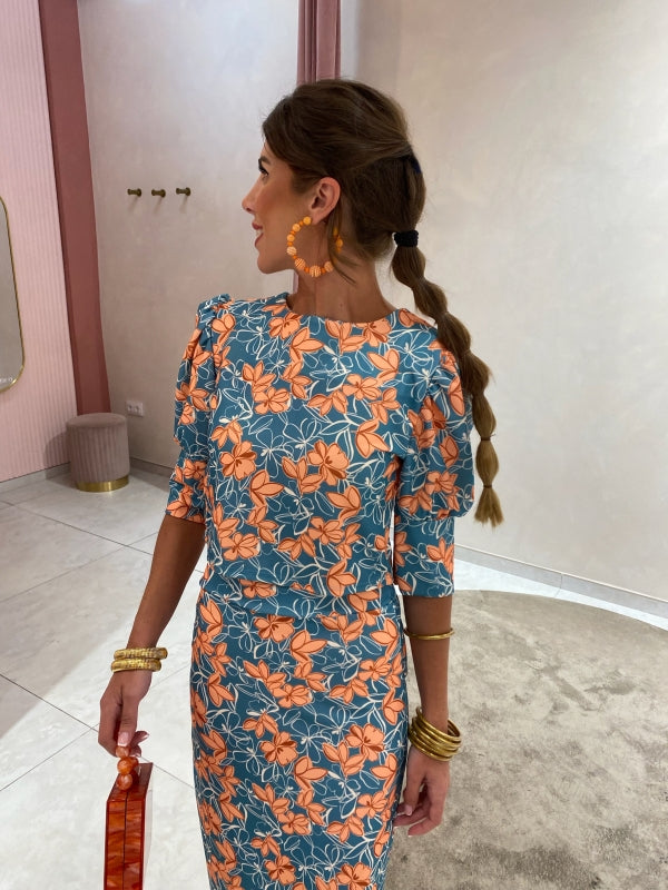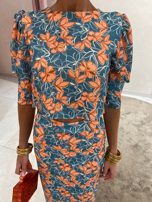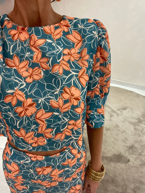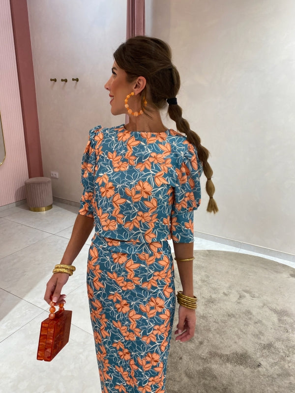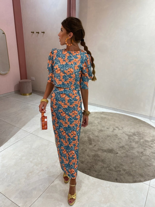 Ensemble Alix, une combinaison sophistiquée de haut à manches courtes et de jupe droite, tous deux ornés d'un imprimé floral aux teintes vert aqua et orange.
