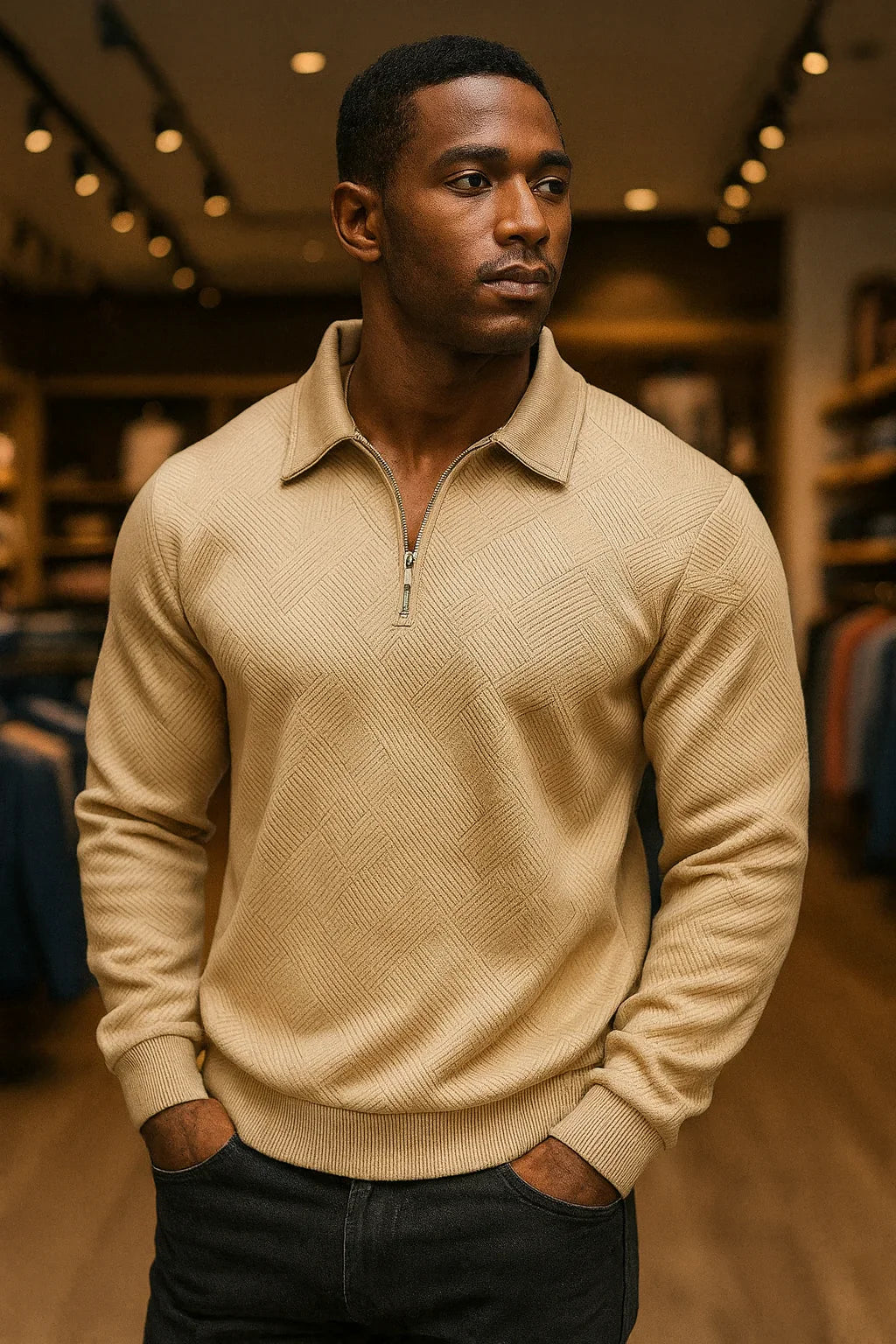 Le Kasper | Pull Texturé à Col Zippé allie raffinement et confort ultime. Le motif de tricot géométrique donne à ce pull une allure unique et moderne, tandis que la coupe décontractée offre liberté de mouvement et confort tout au long de la journée.