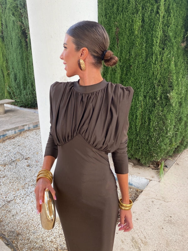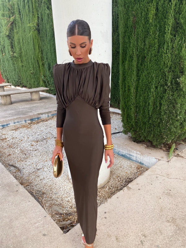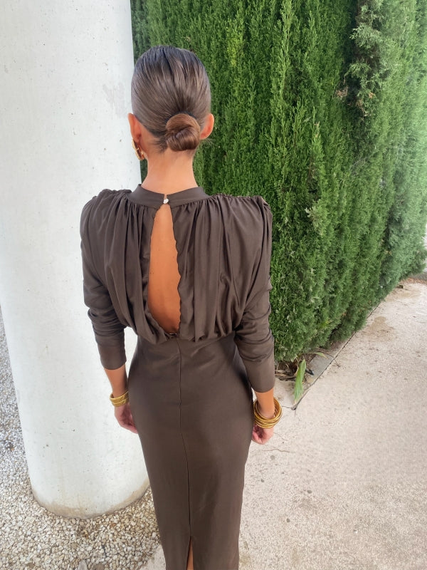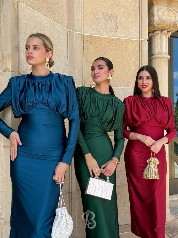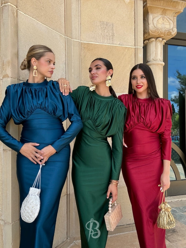 Avec sa fini satin lisse, sa coupe flatteuse et sa fente chic au dos, cette robe allie style intemporel et sophistication moderne. Les manches longues et les épaules structurées ajoutent juste ce qu'il faut de drame, tout en vous gardant confortable toute la nuit.